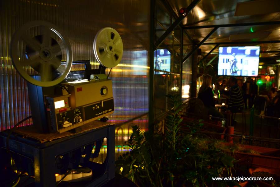 Na terenie Szimpli można znaleźć bary, winiarnie ale też własną piekarnię, sklep, wypożyczalnię rowerów, grill bar, bar witaminowy czy shisha bar. Kolejne drzwi prowadzą do kolejnych barów, pomieszczeń i ogródków, a na piętrze można schować się w jednej z licznych wnęk, w której pochowane są stoły, ławy i krzesła. A już całkiem rozwaliła mnie sala, na której ze starego projektora puszczane były stare filmy i slajdy.